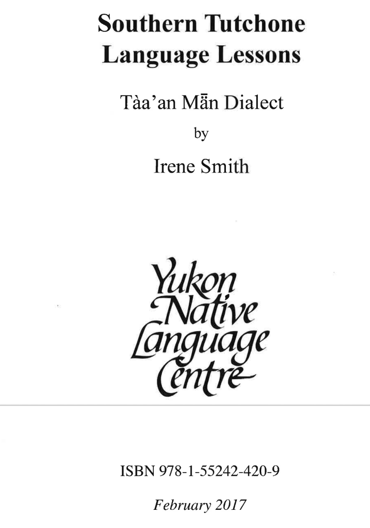 Smith, Irene and Yukon Native Language Centre, 2017. Southern Tutchone Language Lessons: Tàaʼan Mǟn Dialect. Whitehorse, YT: Yukon Native Language Centre. Download Printed Materials  | Download Audio